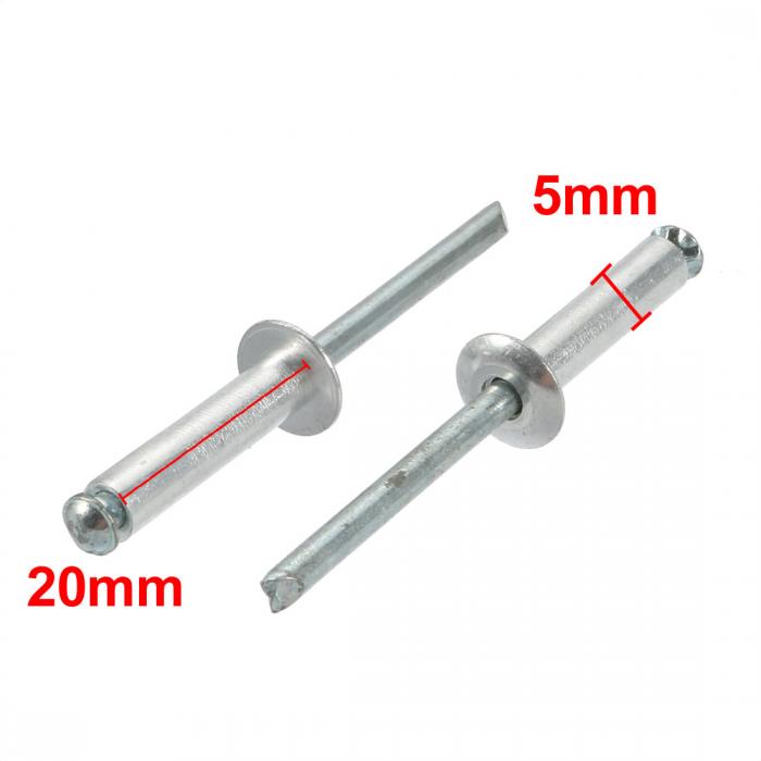 重量:172g; 仕上げ:亜鉛メッキ【属性3】フランジ径:9.3mm; 特徴:オープンエンド【属性4】リベットボディーサイズ:20x 5mm (L * D)。
